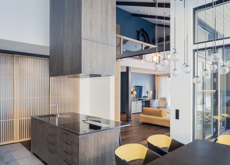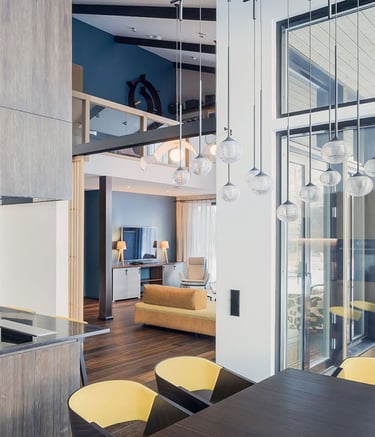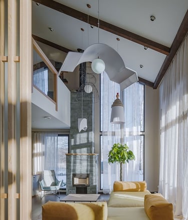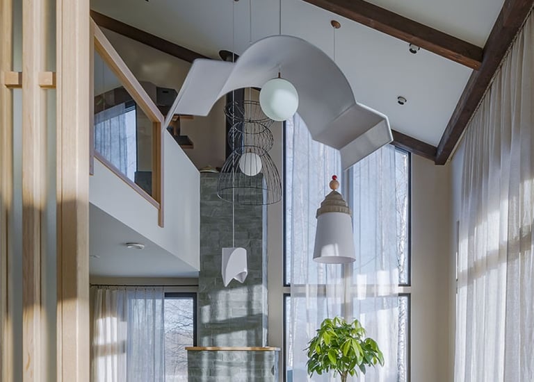 Išskirtiniai šio namo elementai yra svetainės šviestuvai, sukurti specialiai šiam projektui ir pagaminti Lietuvoje.