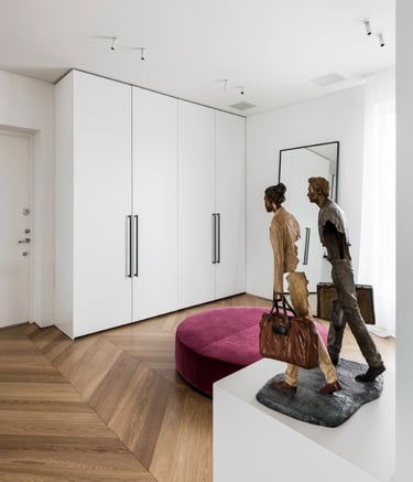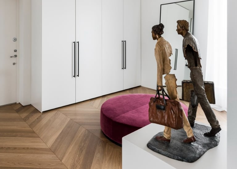 Interjero dizainą įkvėpė rafinuoti užsakovai ir jų išskirtinės žinios meno bei dizaino srityse.