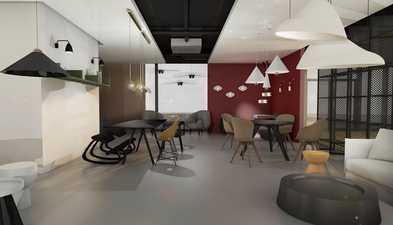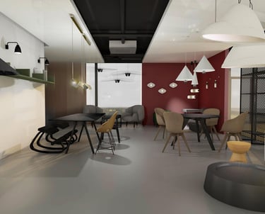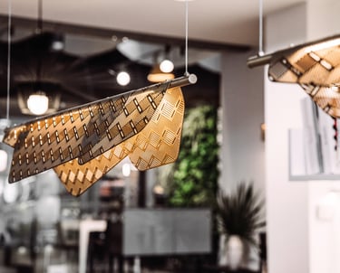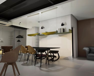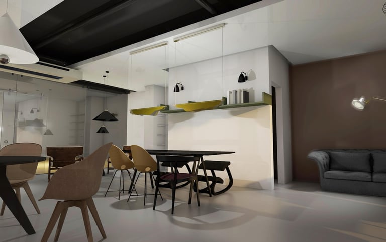 Didelis dėmesys čia skiriamas akcentiniams šviestuvams ir išskirtiniams baldams, kurie tampa pagrindiniais interjero herojais. Kontrastingos sienų spalvos kuria gilumą ir nuotaiką, nebijant tamsesnių sprendimų. Terakotos ir pilkų tonų deriniai subtiliai išryškina medžiagų grožį – veliūro minkštumą, žalvario šilumą ir juodų baldų eleganciją.
