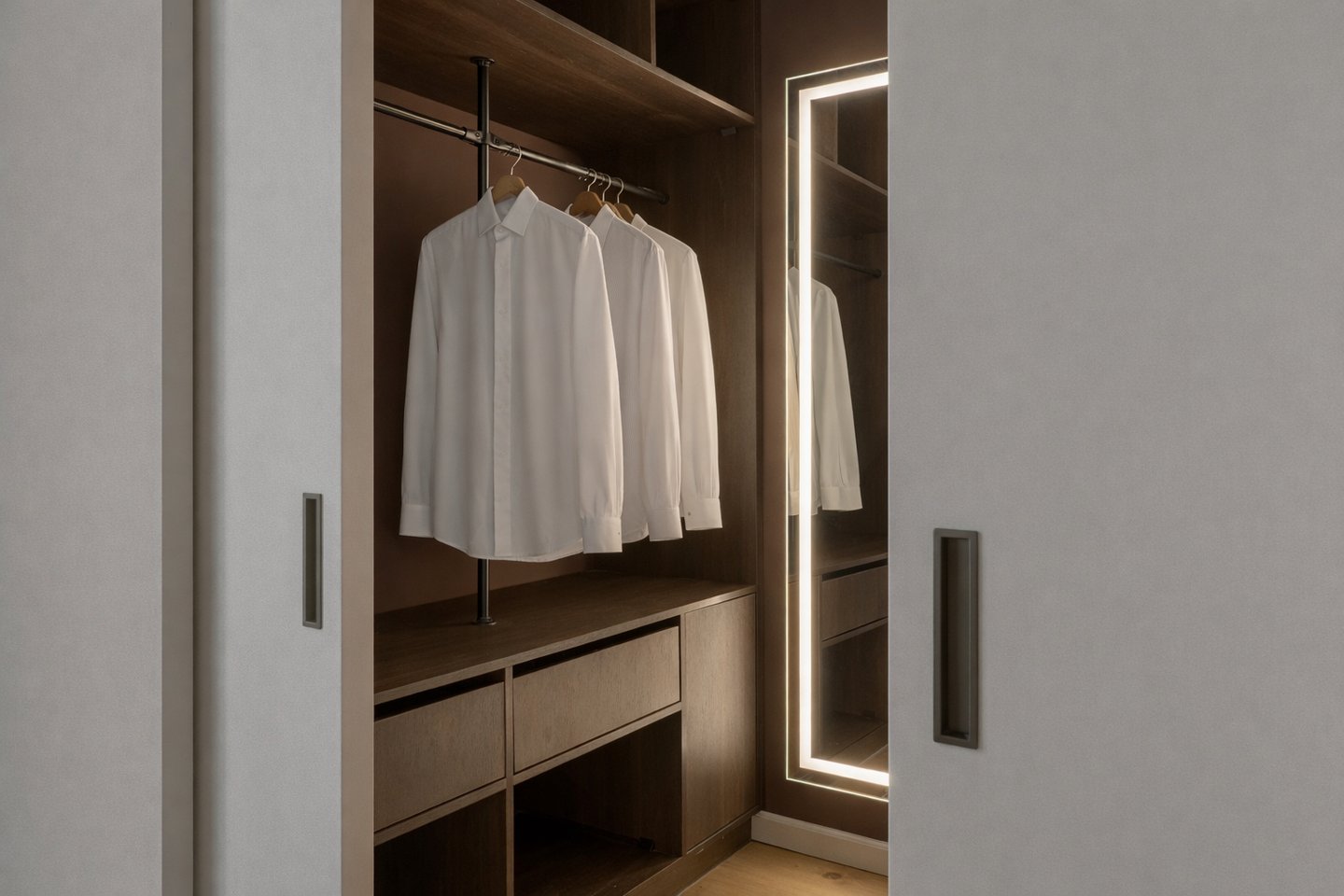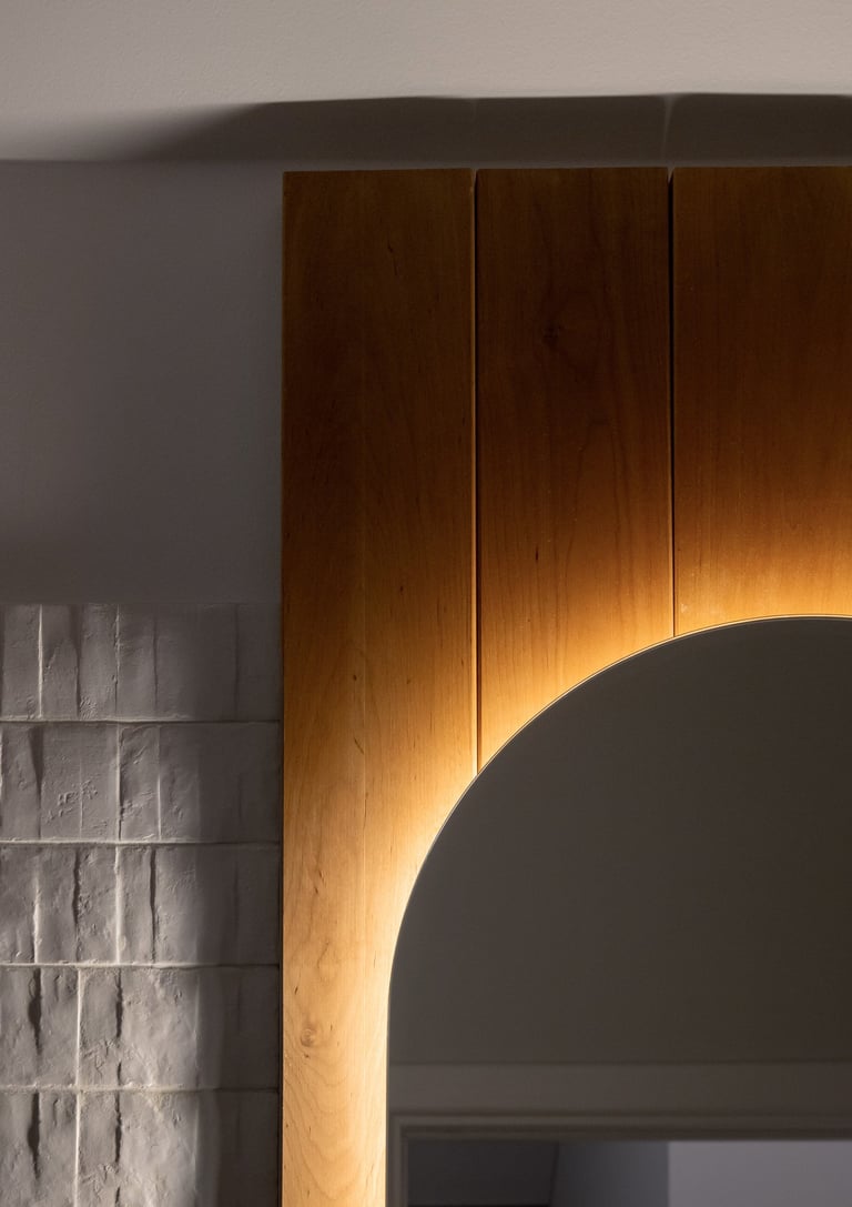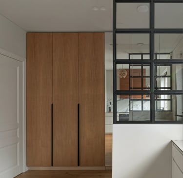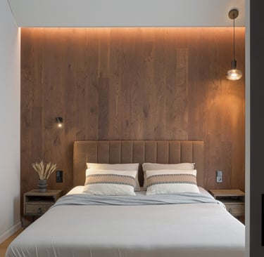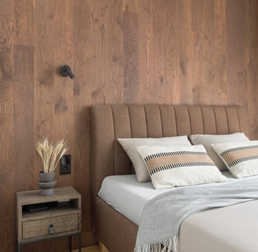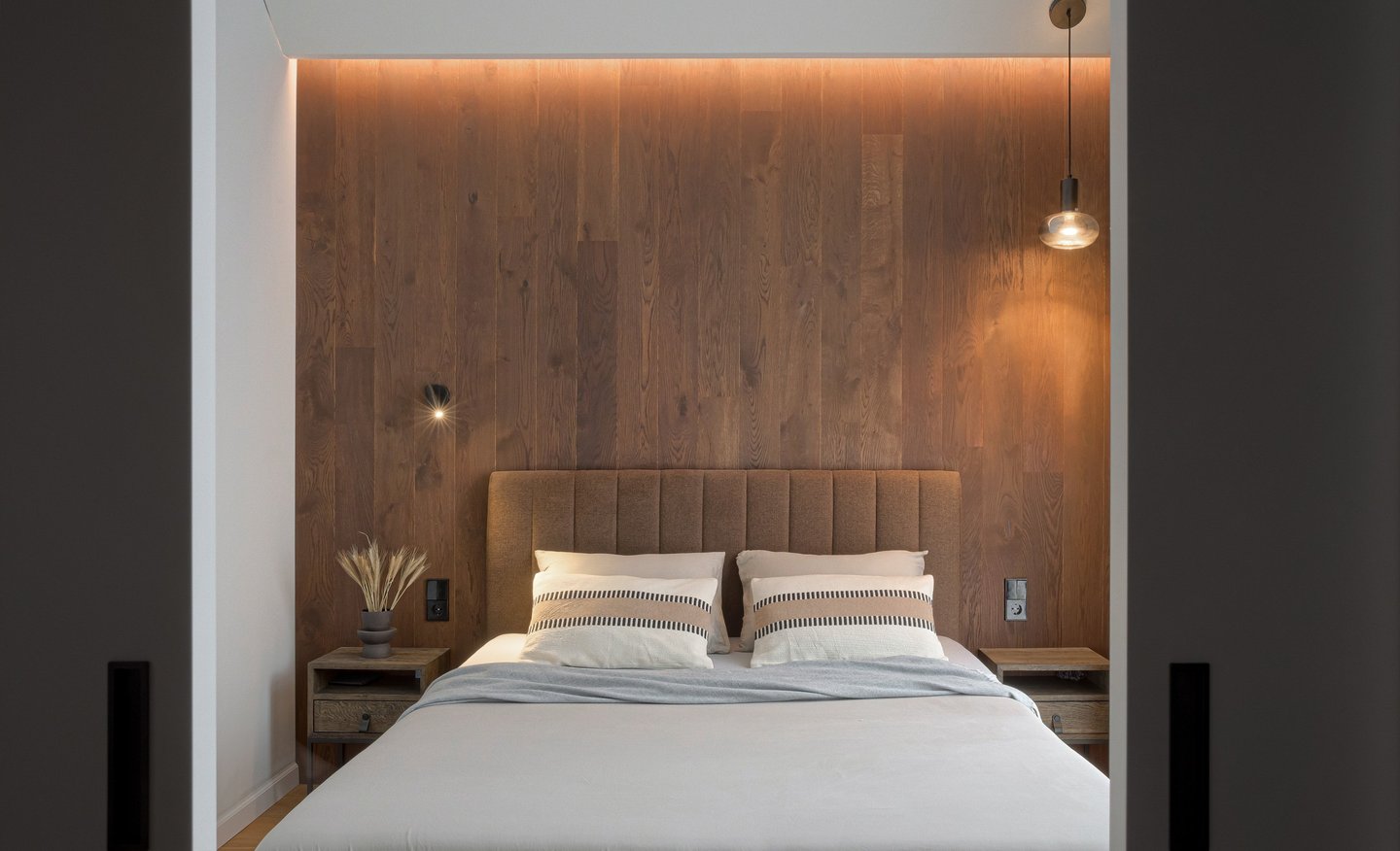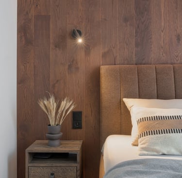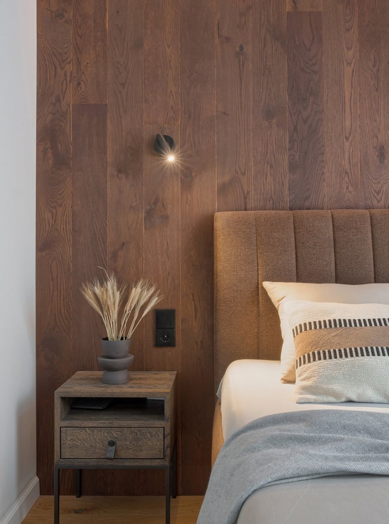 Miegamajame pasirinkau derinti labai artimus, bet kartu skirtingus raštus: medis, tekstilė ir vėl medis. Viskas susiliejo į jaukią formą – savą kaip linas, šiltą kaip medis saulėje. Linijos ir atspalviai čia kuria ramybę, o paprastumas tampa prabanga.
