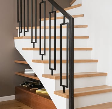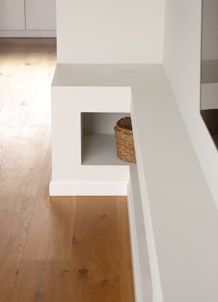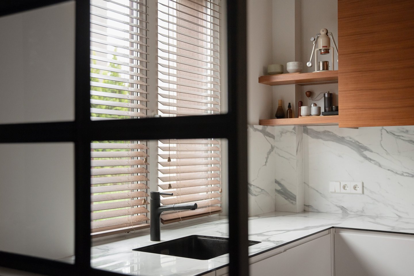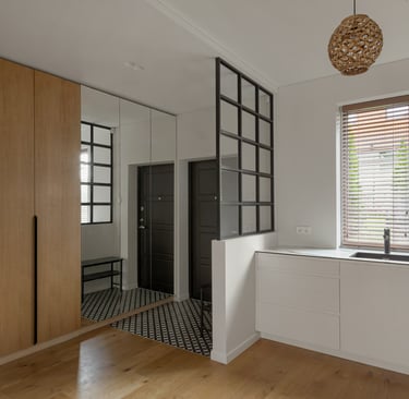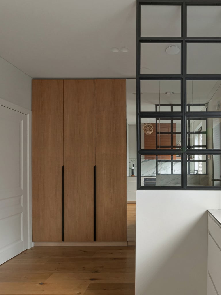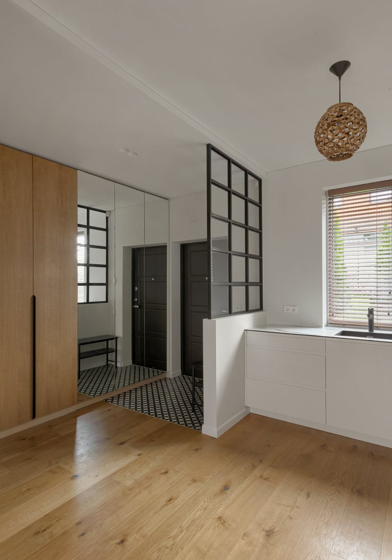 Interjero tikslas – sujungti šviesias erdves, natūralumo estetiką ir loftiškas detales. Nedidelė stiklo pertvara subtiliai papildo erdvę, o pasikartojantys juodi elementai – laiptų turėklai, rėmai ir kitos detalės – kuria ritmą ir savotišką erdvės grafiką.